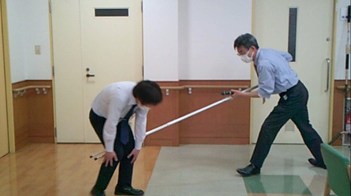 来院者への声かけ・挨拶の重要性や不審者に対してどのような距離感で対応すればよいのか、また、「さすまた」を不審者のどのように押しつければ動きを止められるのかなどご指導をいただきました。